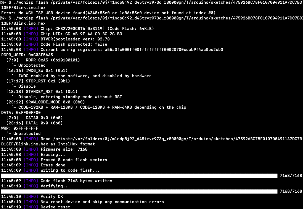 $ ./wchisp flash /private/var/folders/0j/m1ndp8j92_d45trvr973q_r80000gn/T/arduino/sketches/475926BC78F0107004911A7DC7BD13EF/Blink.ino.hex